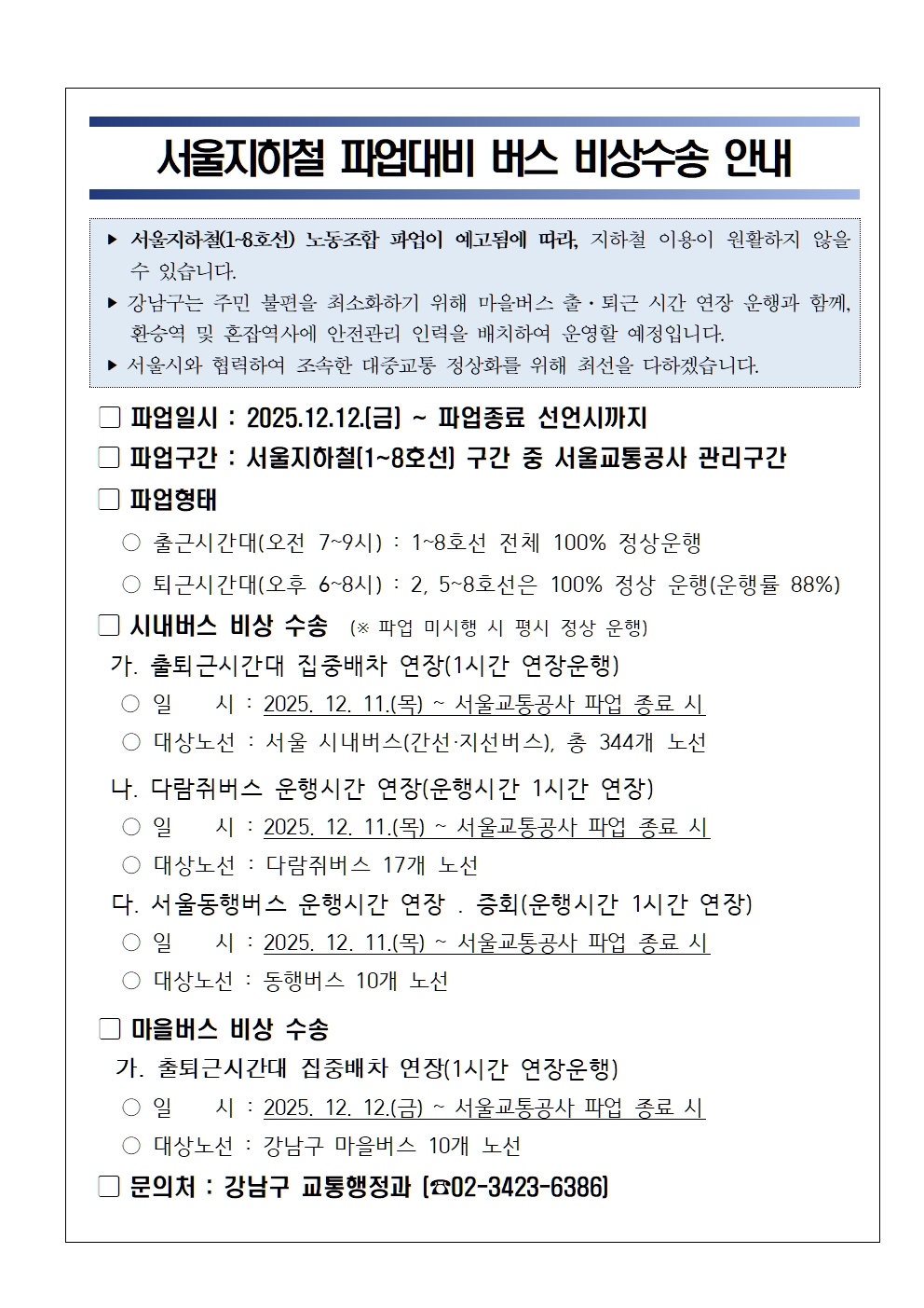 • 안내문_서울지하철 파업대비 버스 비상수송안내.hwpx 안내문_서울지하철 파업대비 버스 비상수송안내.hwpx [85.73 KB] 미리보기