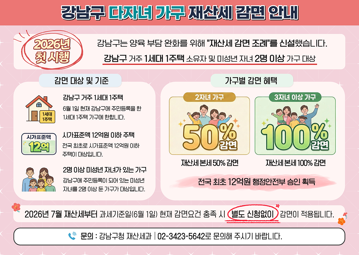 강남구 다자녀가구 재산세 감면 안내