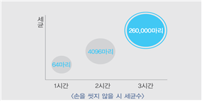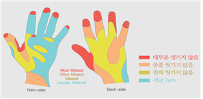 <잘 씻기지 않는 손 부위> <손을 씻지 않을 시 세균수>