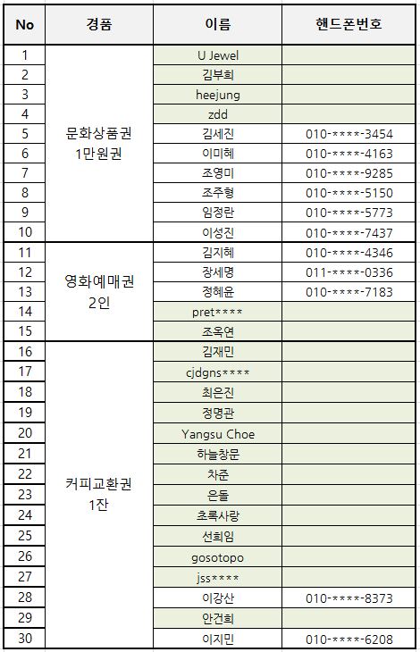 당첨자 중 핸드폰번호를 입력하지 않으신분은 아래 담당자 이메일로 이름(아이디)과 핸드폰번호를 보내주세요! - 담당자 이메일 : luvsk@xosoft.co.kr |