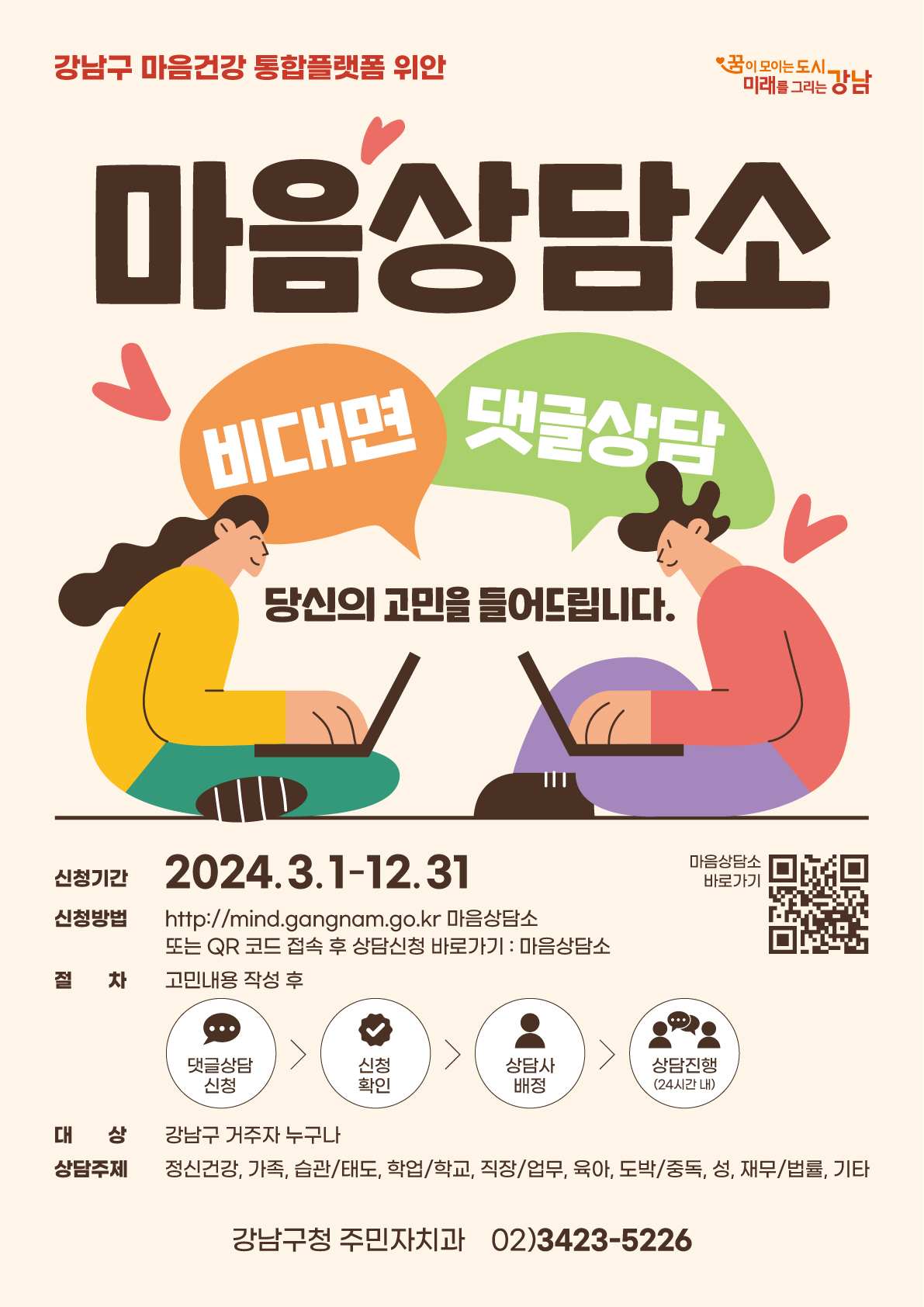 -신청방법 : [바로가기] http://mind.gangnam.go.kr 마음상담소 또는 QR 접속 후 상담신청 바로가기