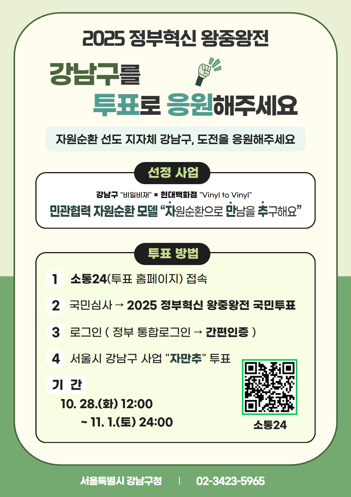 | 안녕하십니까 강남구청입니다. 우리 구청에서 추진하였던 자원순환 사업이 '2025 정부혁신 왕중왕전' 국민투표 대상으로 선정되어 현재 국민투표 중에 있습니다. 서울시 대표로 선정된 지자체 사업인 만큼, 강남구민 여러분의 많은 관심과 응원 부탁드립니다. [투표내용] ■ 투표개요 : 2025 정부혁신 왕중왕전 국민투표(분야 1: 국민과 함께 만드는 참여소통 혁신) |