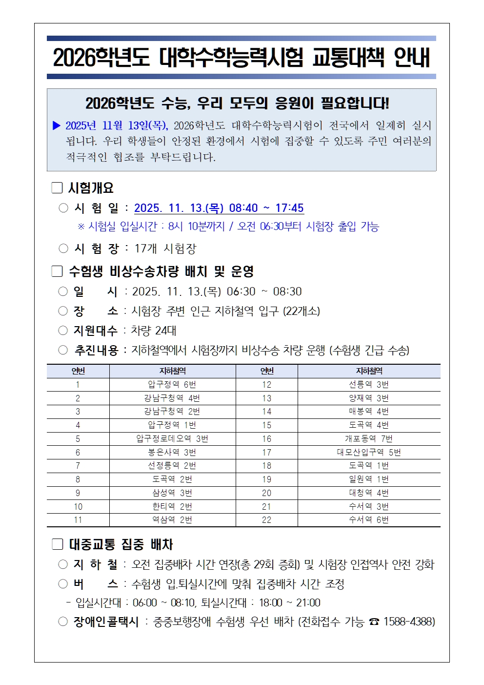• 2026학년도 대학수학능력시험 교통대책 안내.pdf 2026학년도 대학수학능력시험 교통대책 안내.pdf [110.36 KB] 미리보기