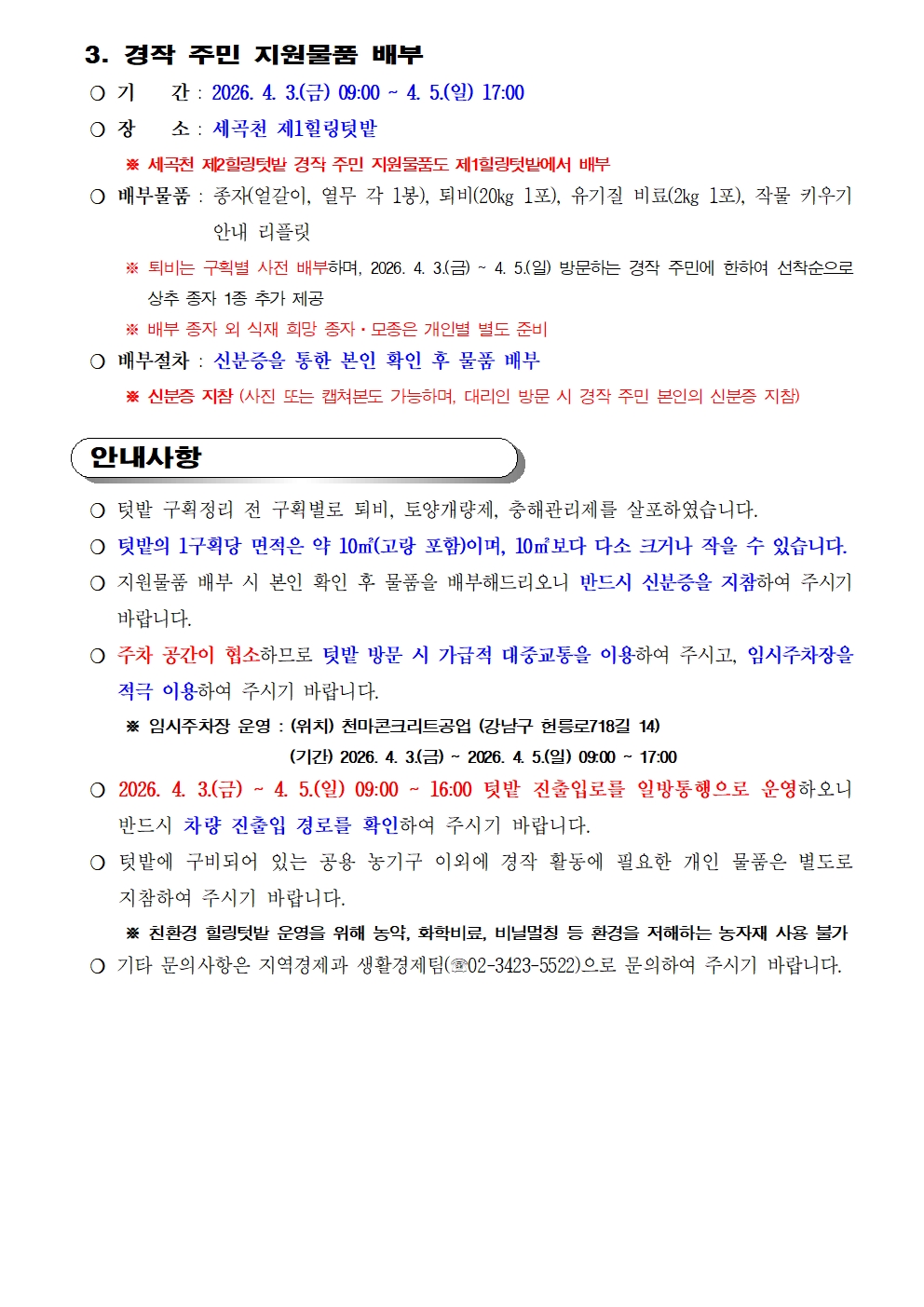 2026년 세곡천 힐링텃밭 구획번호 배정 결과 및 개장 일정 안내