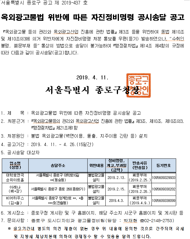 • 옥외광고물법 위반에 따른 자진정비명령 공시송달 공고문(2019. 4. 11.).hwp 옥외광고물법 위반에 따른 자진정비명령 공시송달 공고문(2019. 4. 11.).hwp [40.5 KB] 미리보기