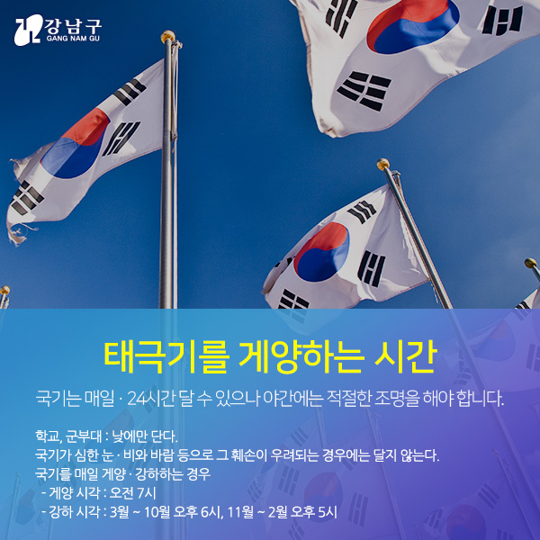 국기는 매일·24시간 달 수 있으나 야간에는 적절한 조명을 해야 합니다.