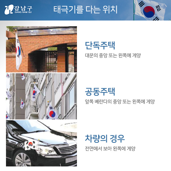 - 차량이나 보행자의 통행에 지장을 줄 우려가 있거나 깃대가 짧아 조기로 게양할 수 없는 등 부득이한 사유가 있는 경우, 최대한 내려서 게양