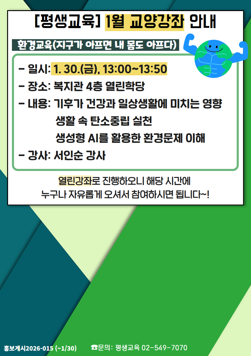 | 평생교육 사업에서는 환경교육을 실시하여 기후 변화가 노년층의 건강과 일상생활에 미치는 영향을 이해하도록 돕고, 건강하고 지속 가능한 노후생활을 지원하고자 1월 교양강좌 「지구가 아프면 내 몸도 아프다」를 실시하고자 합니다. |