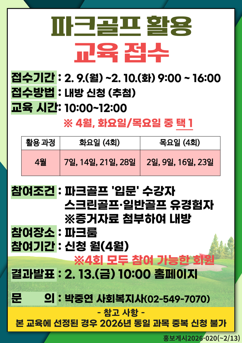 | 파크골프 활용 교육을 접수받습니다! 파크골프 '입문' 수강자 혹은 스크린골프·일반골프 유경험 회원님의 적극적인 신청 바랍니다! |