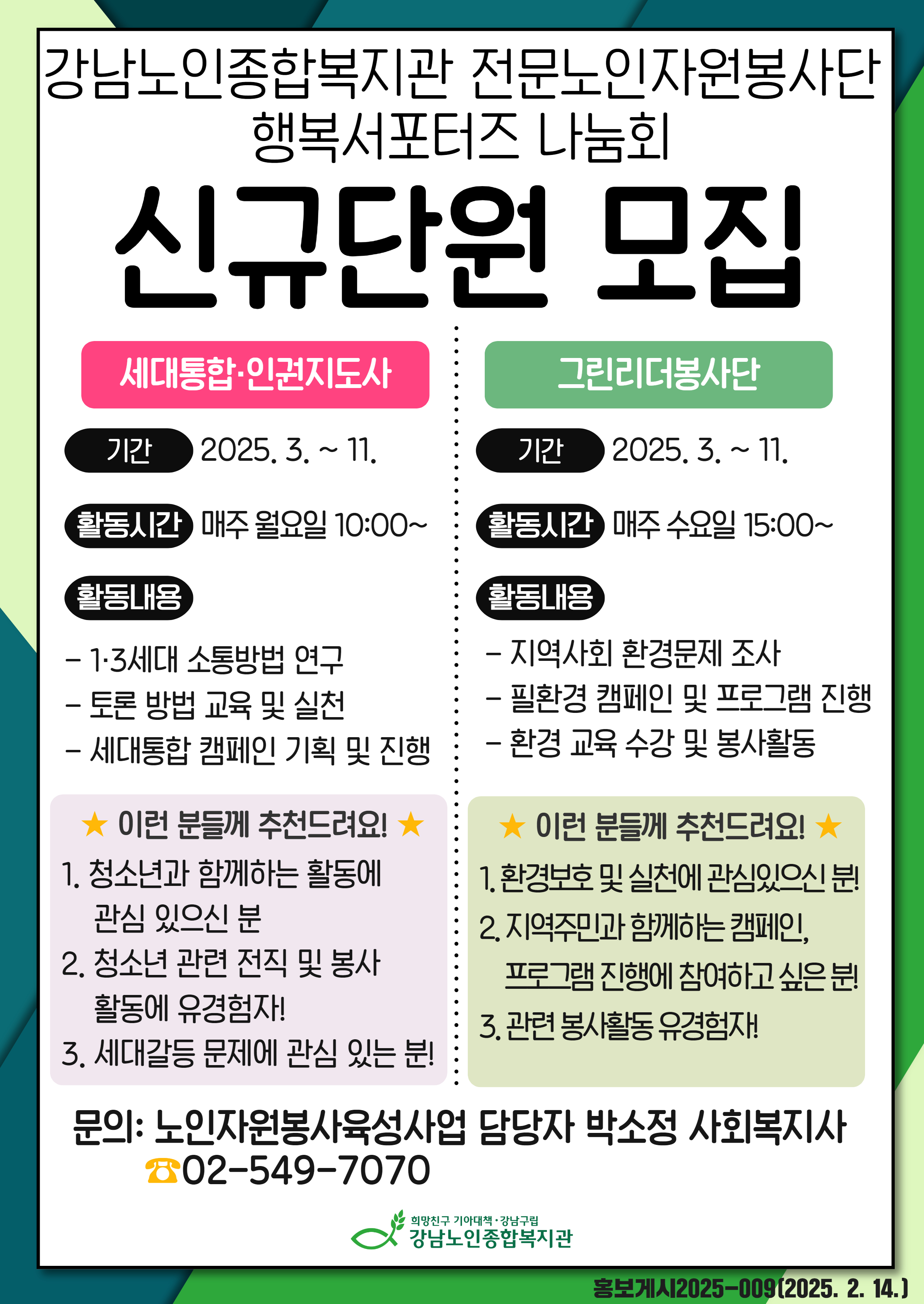 | 강남노인종합복지관 전문 노인자원봉사단 '행복서포터즈 나눔회'에서 신규 단원을 추가모집합니다. 선배시민으로서 지역사회와 후배시민을 위한 활동에 관심있는 분들의 참여 부탁드립니다! |