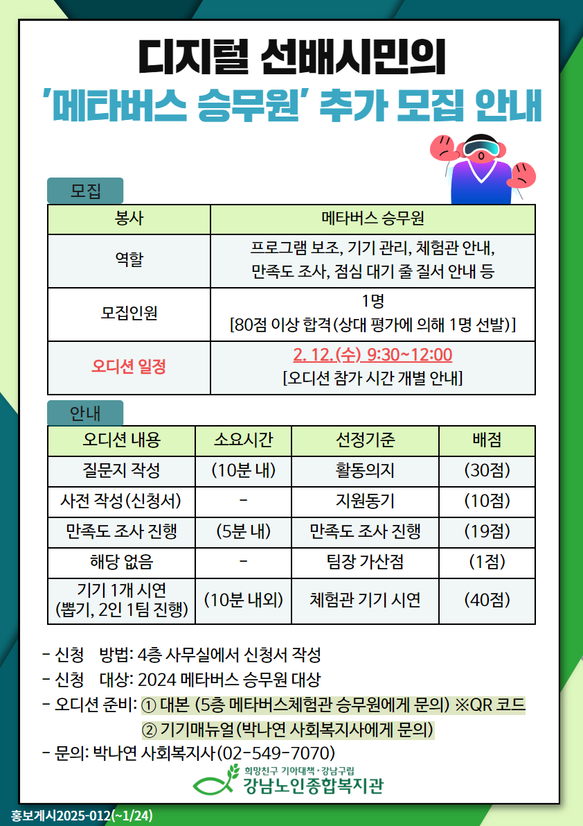 | 메타버스체험관을 안내하실 선배시민 '메타버스 승무원'을 모집합니다! |