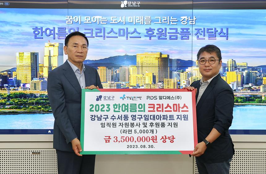 강남구(구청장 조성명)가 30일 구청 작은회의실에서 ‘한여름의 크리스마스 후원금폼 전달식’을 열어 청운교회, ㈜레오이경제, RDS 알디에스(주)로부터 화장지 및 라면, 김세트 등의 식료품을 전달 받았다. 이날 전달 받은 후원품은 강남복지재단을 통해 수서동 영구임대아파트에 지원될 예정이다.