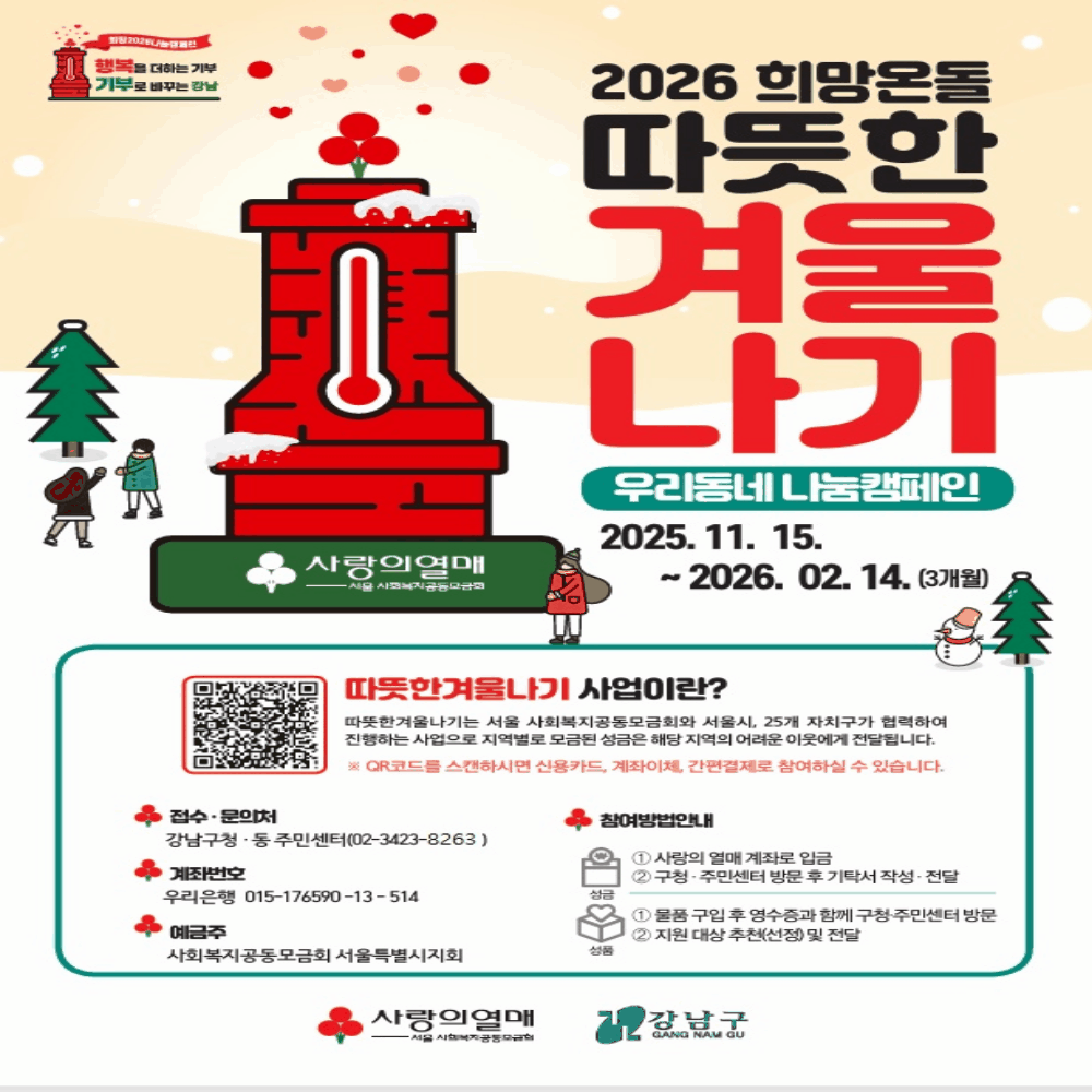 강남구와 서울사회복지공동모금회가 함께 희망온돌 따뜻한 겨울나기 사업을 전개하여