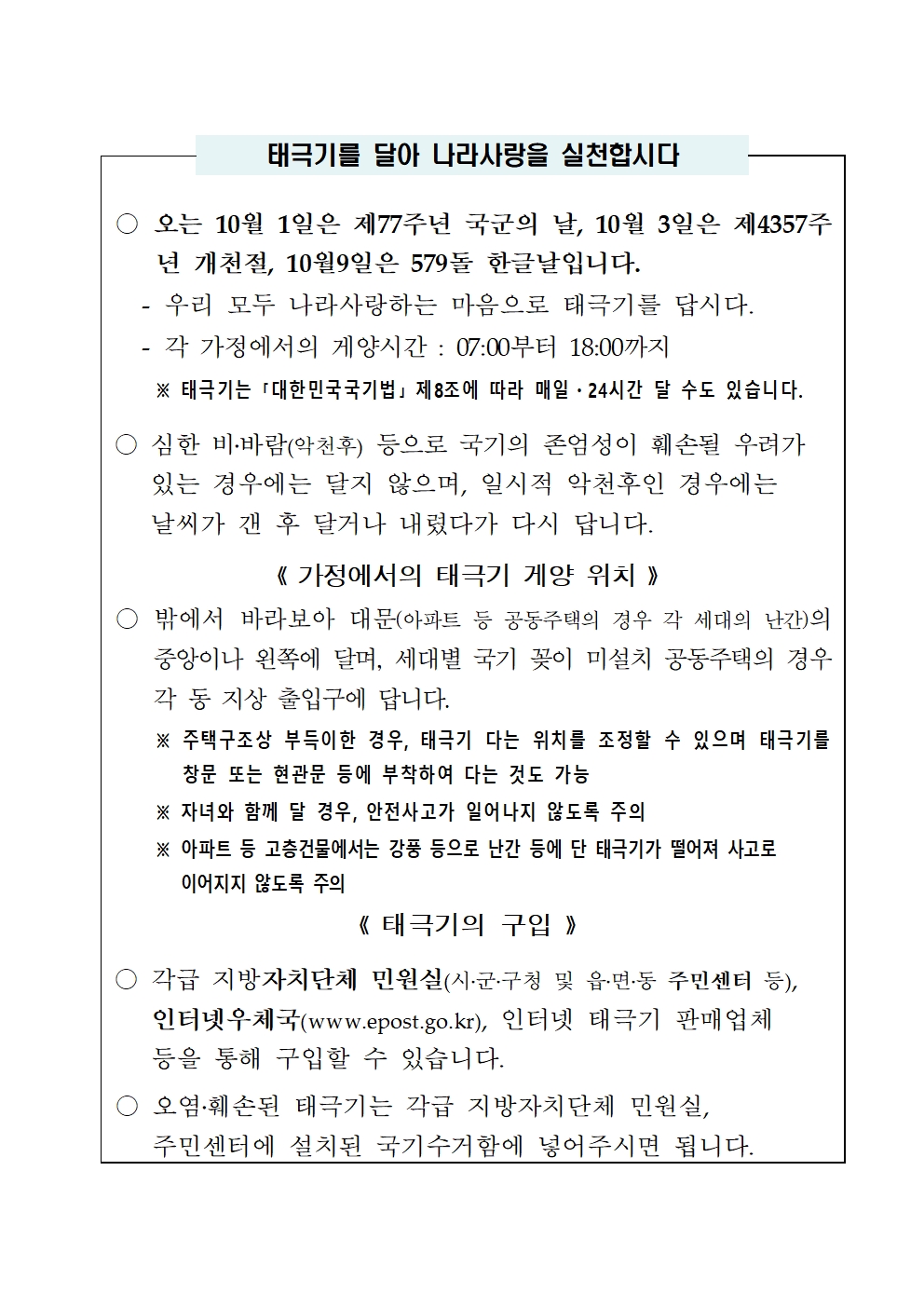 10월 나라사랑 태극기 달기 협조 요청