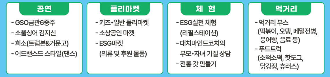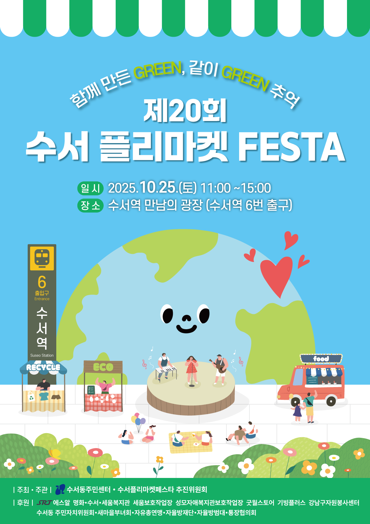 ESG체험과 문화 콘텐츠 향유를 통해 탄소중립을 실천하고 지역 주민 화합의 장을 마련하고자「제 20회 수서 플리마켓 FESTA」를 아래와 같이 개최하고자 합니다. 관심 있는 구민들의 많은 참여 바랍니다.