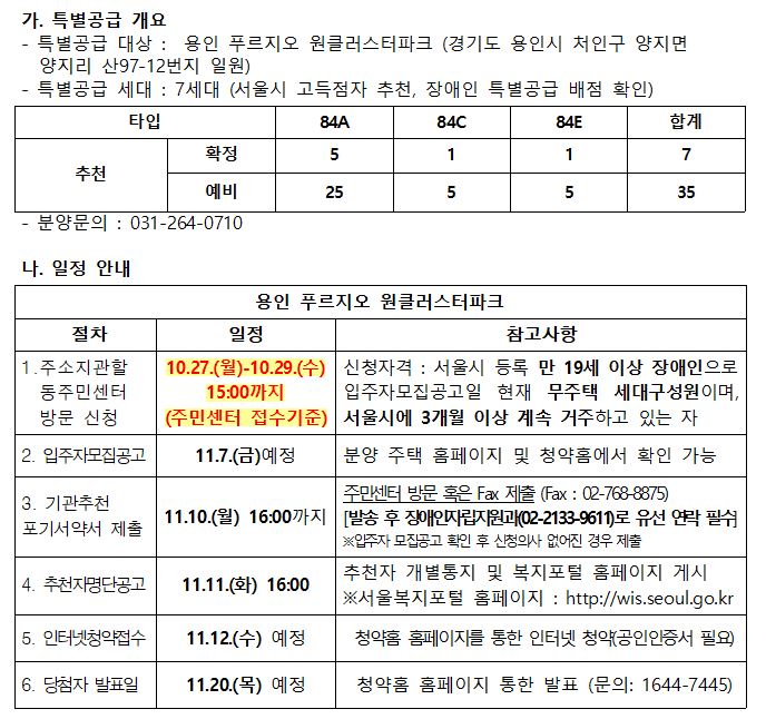 용인 푸르지오 원클러스터파크 서울시 장애인 특별공급 기관추천 안내