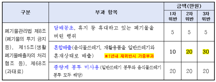 생활쓰레기 혼합배출 및 무단투기 단속 재안내(과태료)