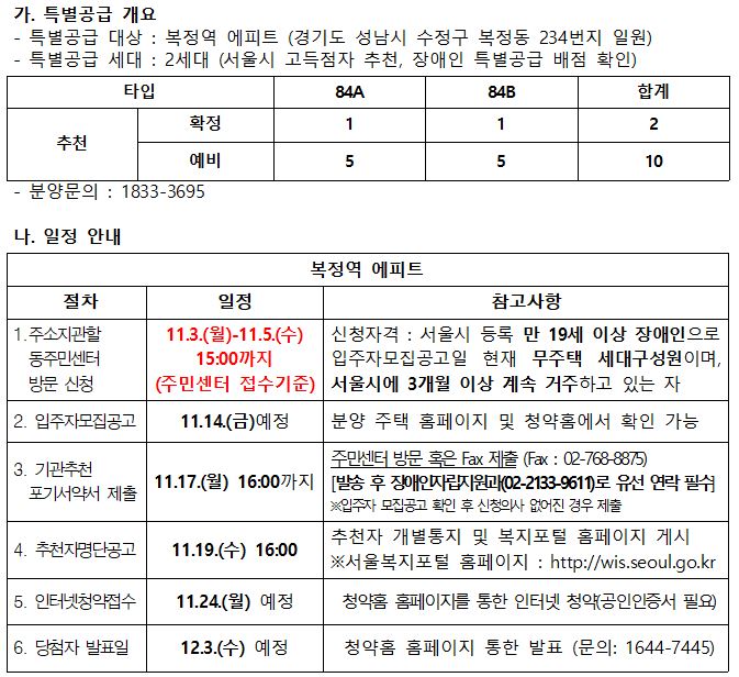 복정역 에피트 서울시 장애인 특별공급 기관추천 안내