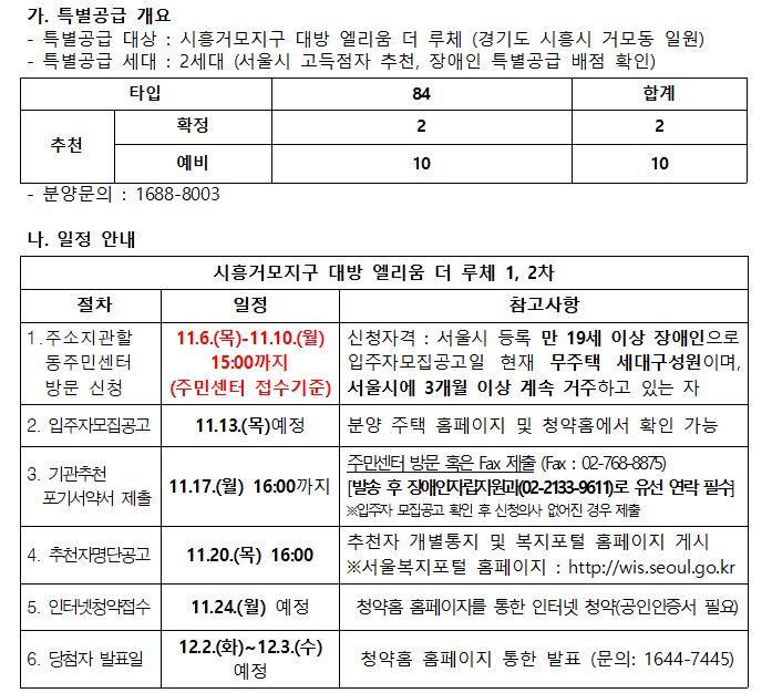 시흥거모지구 대방 엘리움 더 루체 서울시 장애인 특별공급 기관추천 안내