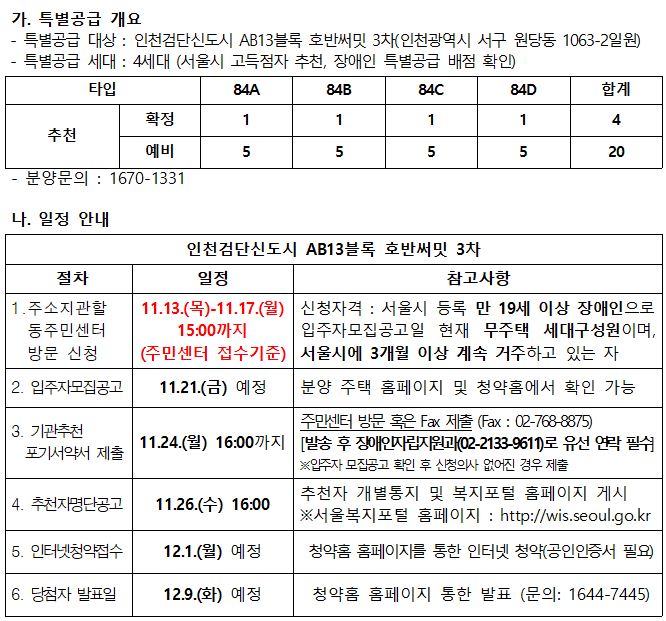 인천검단신도시 AB13블록 호반써밋 3차 서울시 장애인 특별공급 기관추천 안내