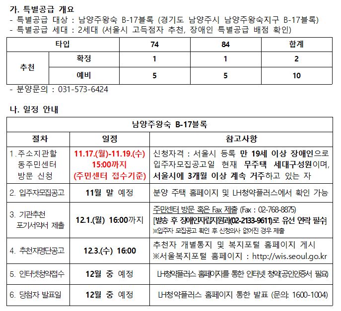 남양주왕숙 B-17블록 서울시 장애인 특별공급 기관추천 안내