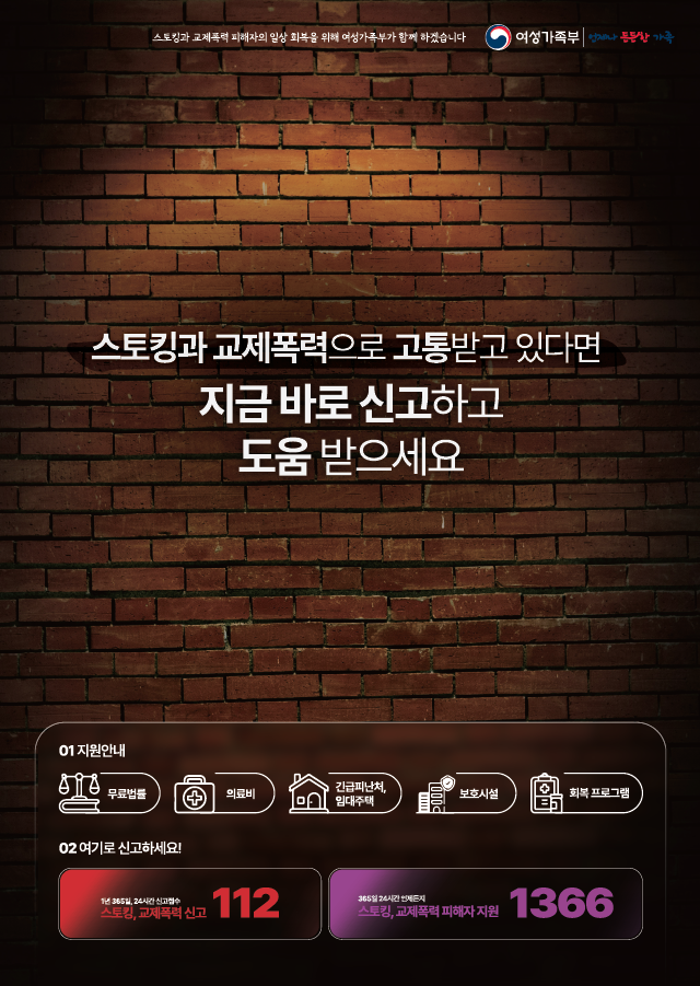 스토킹과 교제폭력으로 고통받고 있다면 지금 바로 신고하고 도움 받으세요!