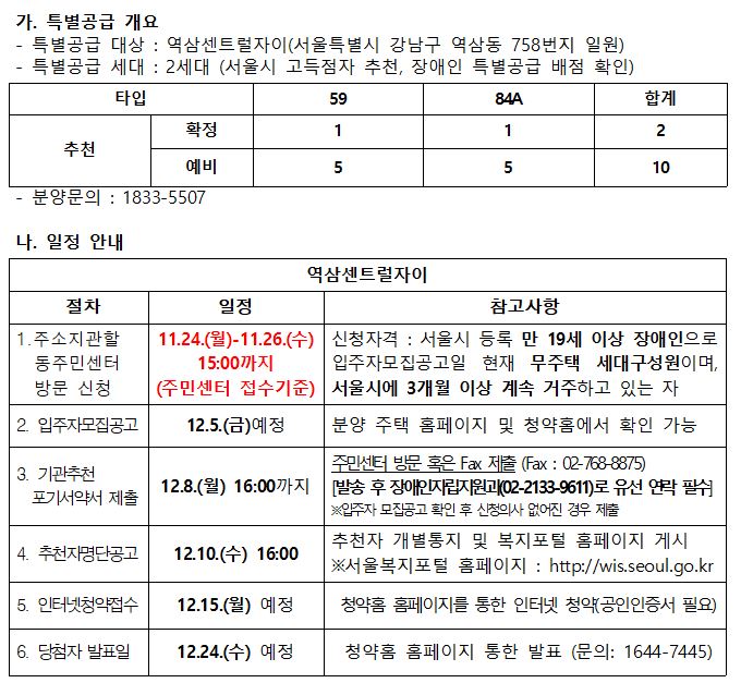 역삼센트럴자이 서울시 장애인 특별공급 기관추천 안내