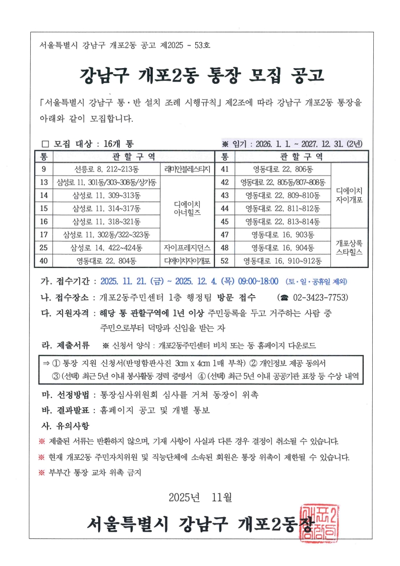 개포2동 통장 모집 공고 (접수기간 : 2025. 11. 21.(금) ~ 12. 4.(목))