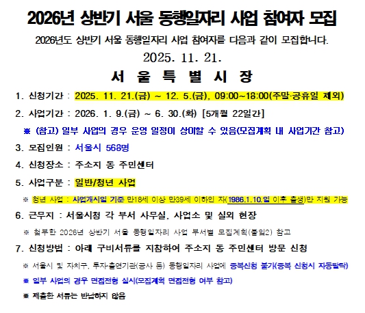 [붙임1] 2026년 상반기 서울 동행일자리 사업 참여자 모집공고(신청서, 동의서 등).hwpx [114.66 KB]