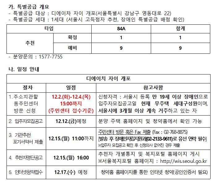 디에이치 자이 개포 서울시 장애인 특별공급 기관추천 안내