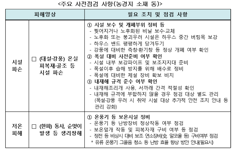 겨울철 농업재해를 대비하기 위한 참고자료와 홍보물을 공유드리오니, 관내 농업인들은 참고하시기 바랍니다. 아울러 농업재해 발생시 피해신고서(붙임2)를 작성하여 지역경제과로 제출해주시기 바랍니다. ※ 농업재해보험 및 농업인안전보험 가입 안내(가입처 : 해당 지역농협)