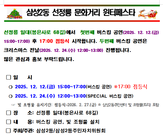 삼성2동 선정릉 문화거리 윈터페스타 안내(2025.12.12.(금), 12.24.(수))