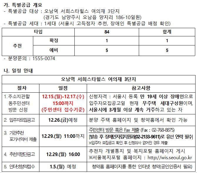 오남역 서희스타힐스 여의재 3단지 서울시 장애인 특별공급 기관추천 안내