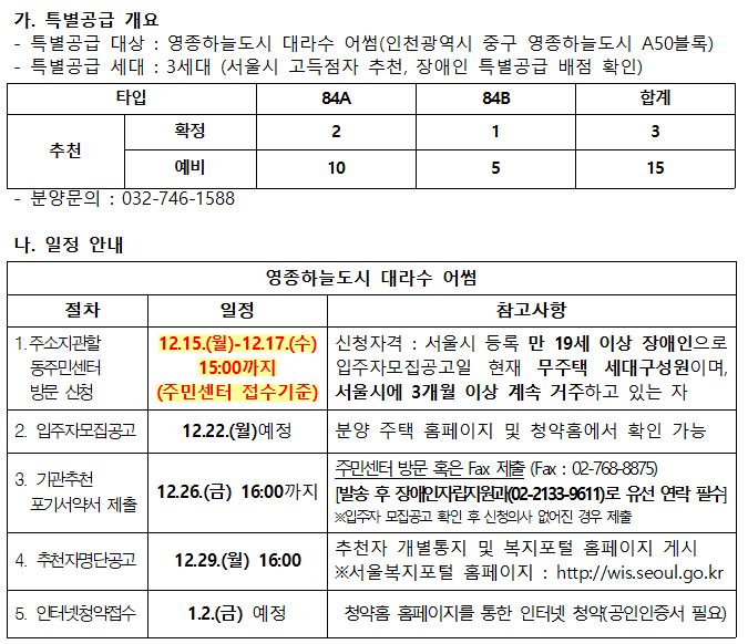 영종하늘도시 대라수 어썸 서울시 장애인 특별공급 기관추천 안내