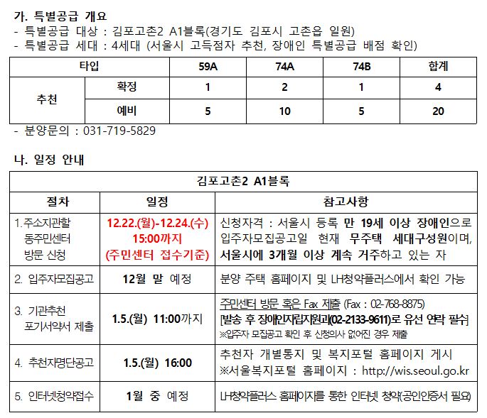 김포고촌2 A1블록 서울시 장애인 특별공급 기관추천 안내