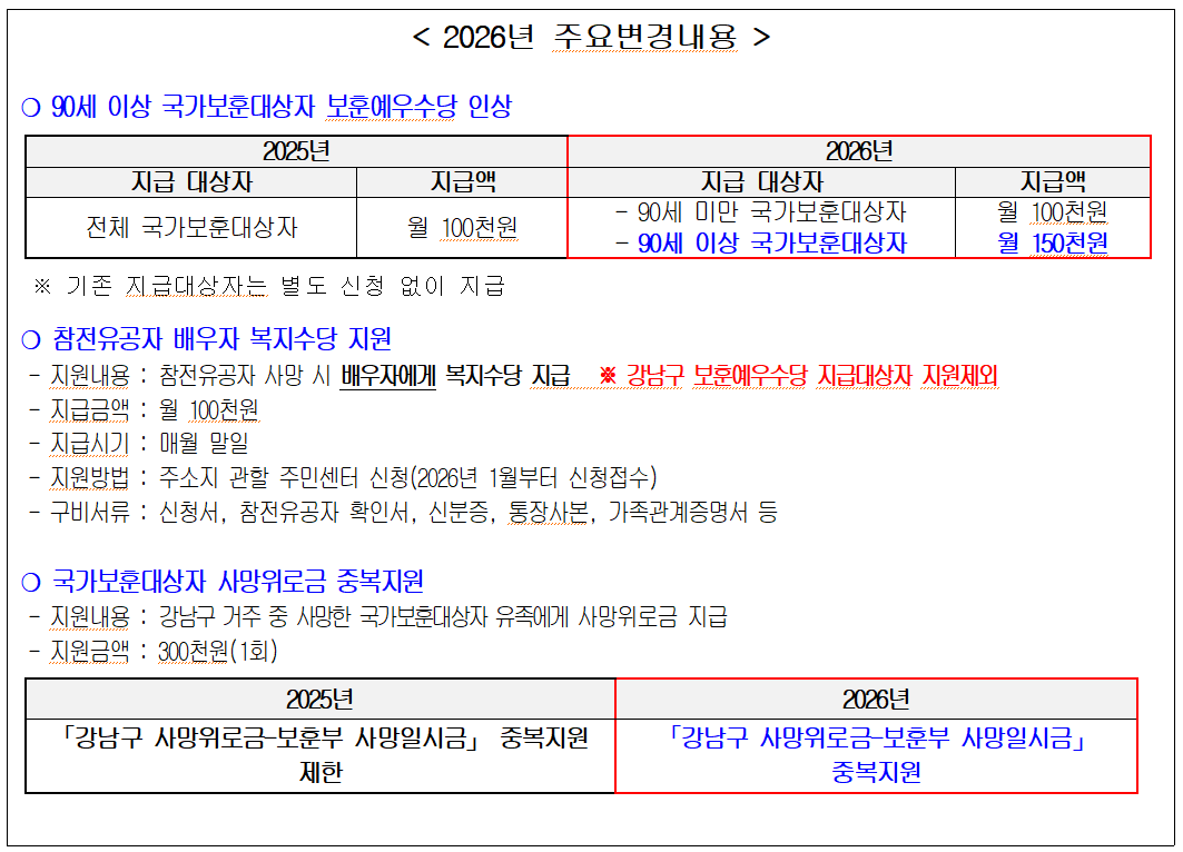 「2026년 강남구 국가보훈대상자 보훈수당 등 지원」에 대해 아래와 같이 안내드립니다.