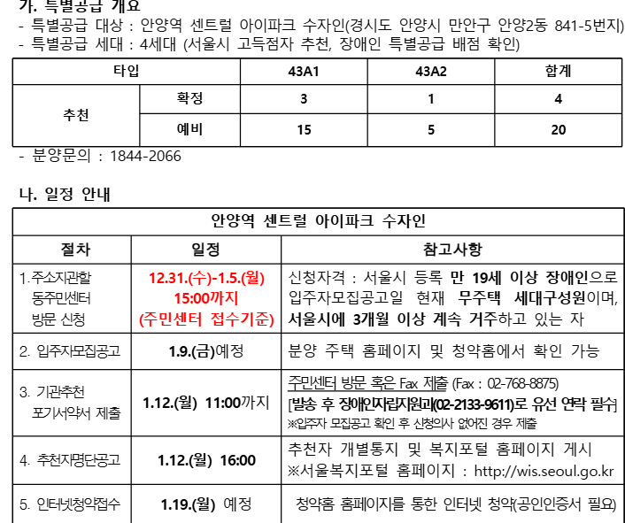 안양역 센트럴 아이파크 수자인 서울시 장애인 특별공급 기관추천 안내