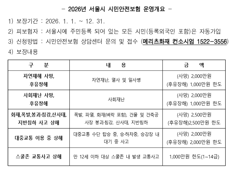 「2026년 서울시 시민안전보험」이 시행됨에 따라 관련 내용을 알려 드리오니, 각종 재난·안전사고 피해가 발생할 경우 참고하시기 바랍니다. 붙임 2026년 서울시 시민안전보험 안내문 1부