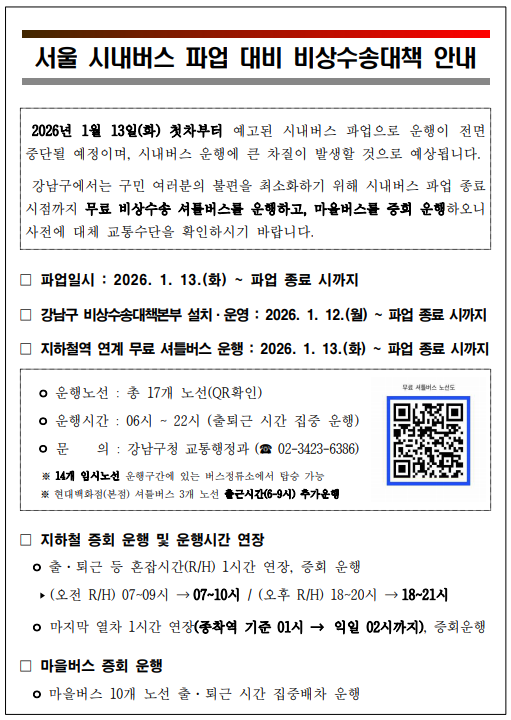 2026년 1월 13일(화) 시내버스 파업 대비 강남구 비상수송대책 안내