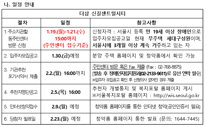 더샵 신길센트럴시티 서울시 장애인 특별공급 기관추천 안내