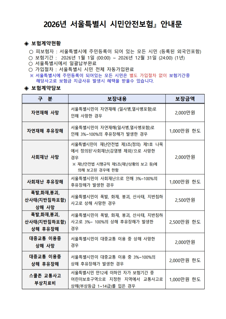 2026년 서울특별시 시민안전보험 안내