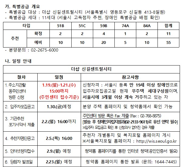 더샵 신길센트럴시티 서울시 장애인 특별공급 기관추천 안내