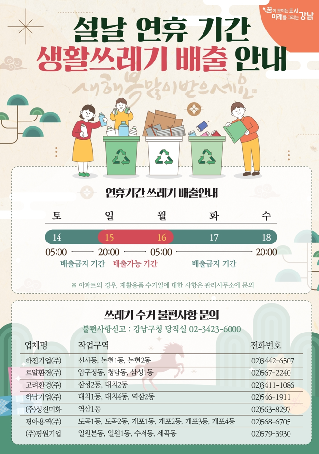 설날 연휴 기간 생활쓰레기 배출 안내