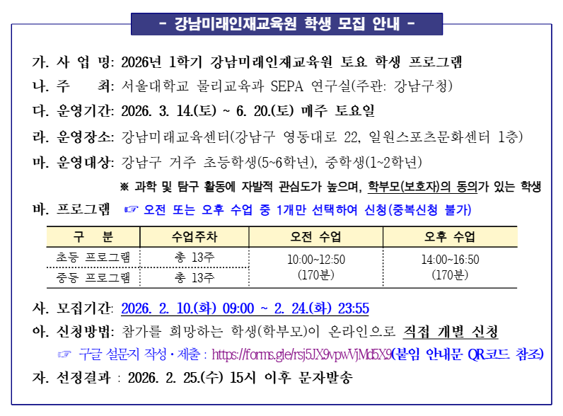 [안내문] 2026-1 강남미래인재교육원 토요 학생 프로그램 모집 안내문 (1).hwpx [124.97 KB]