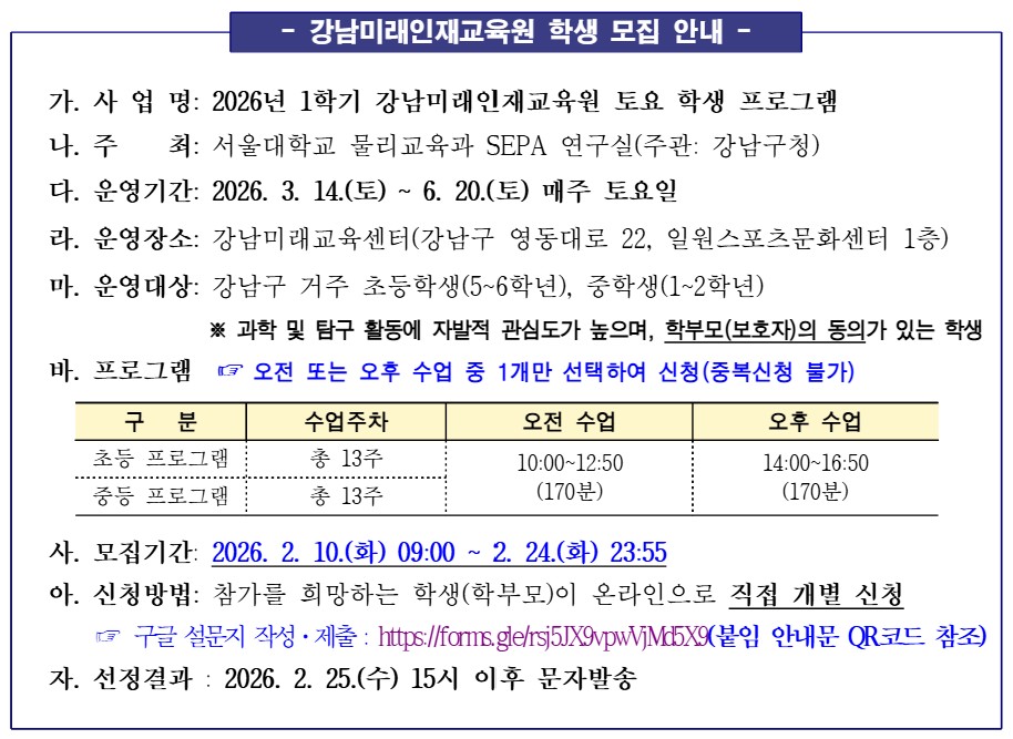 강남구와 서울대학교가 협력·운영하는 2026년 1학기 강남미래인재교육원 토요 학생 프로그램 <강남스타일로 과학하기> 를 다음과 같이 안내드리니 많은 신청 바랍니다.