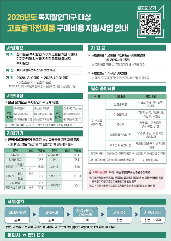 한국전력공사 2026년도 복지할인가구 대상 고효율가전제품 구매비용 지원사업 안내