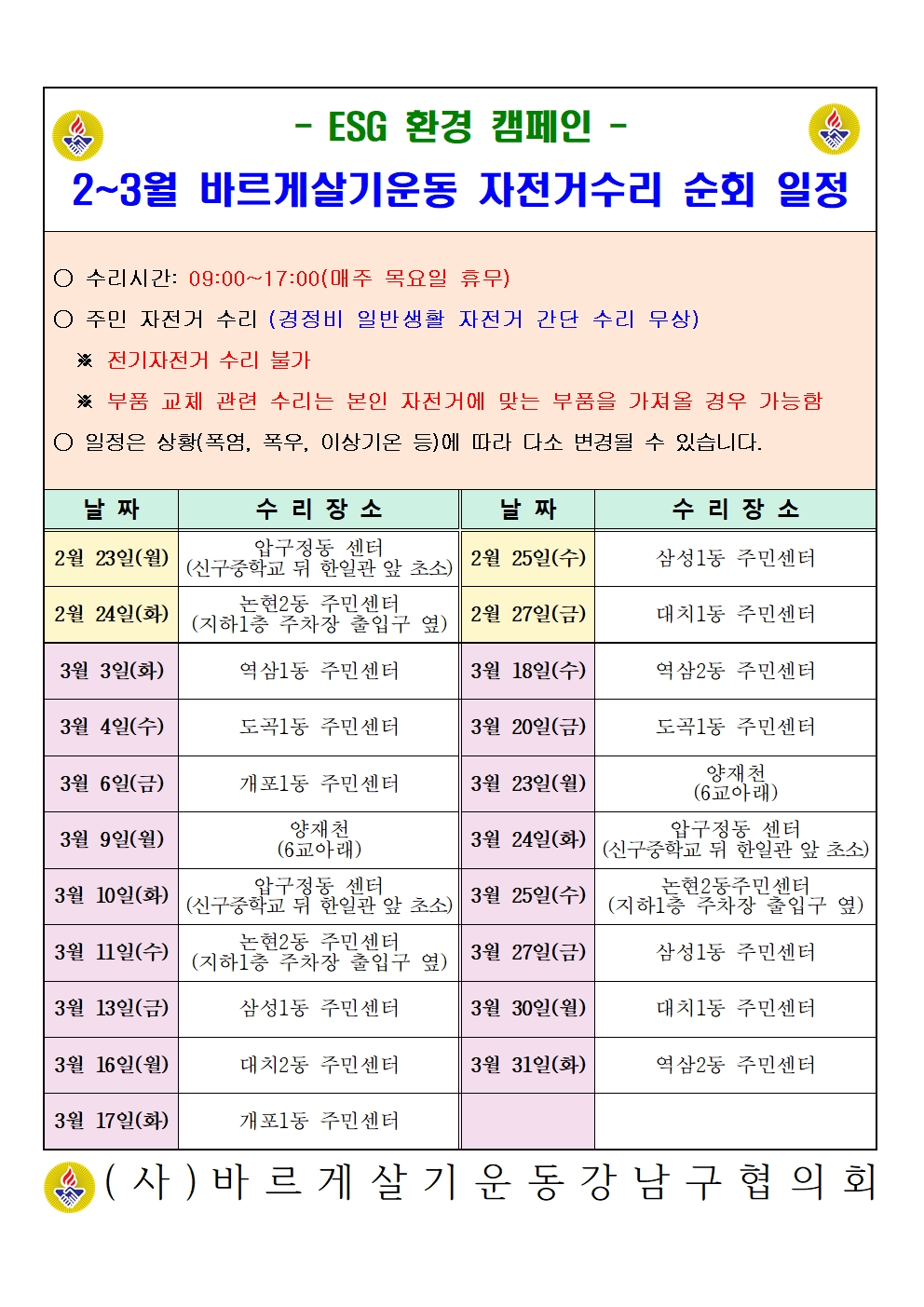 바르게살기운동협의회 자전거 수리 순회 일정(2~3월) (변경)
