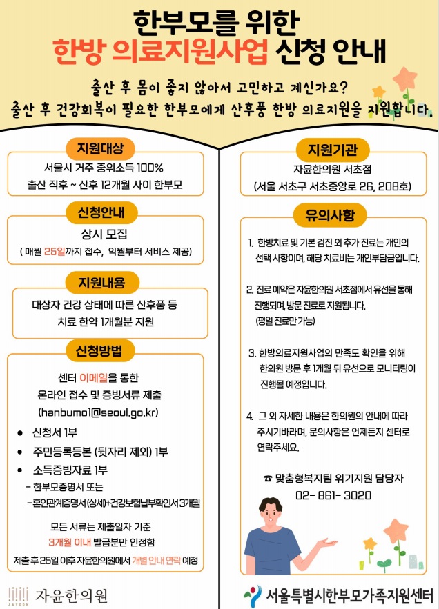 마. 신청방법: 신청서(붙임 2)와 증빙서류를 센터 메일(hanbumo1@seoul.go.kr)로 제출