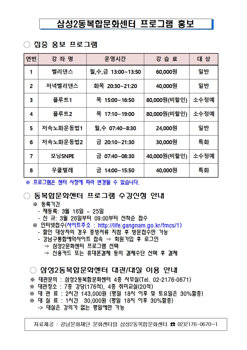 삼성2동복합문화센터 프로그램 안내(2026년 3월)