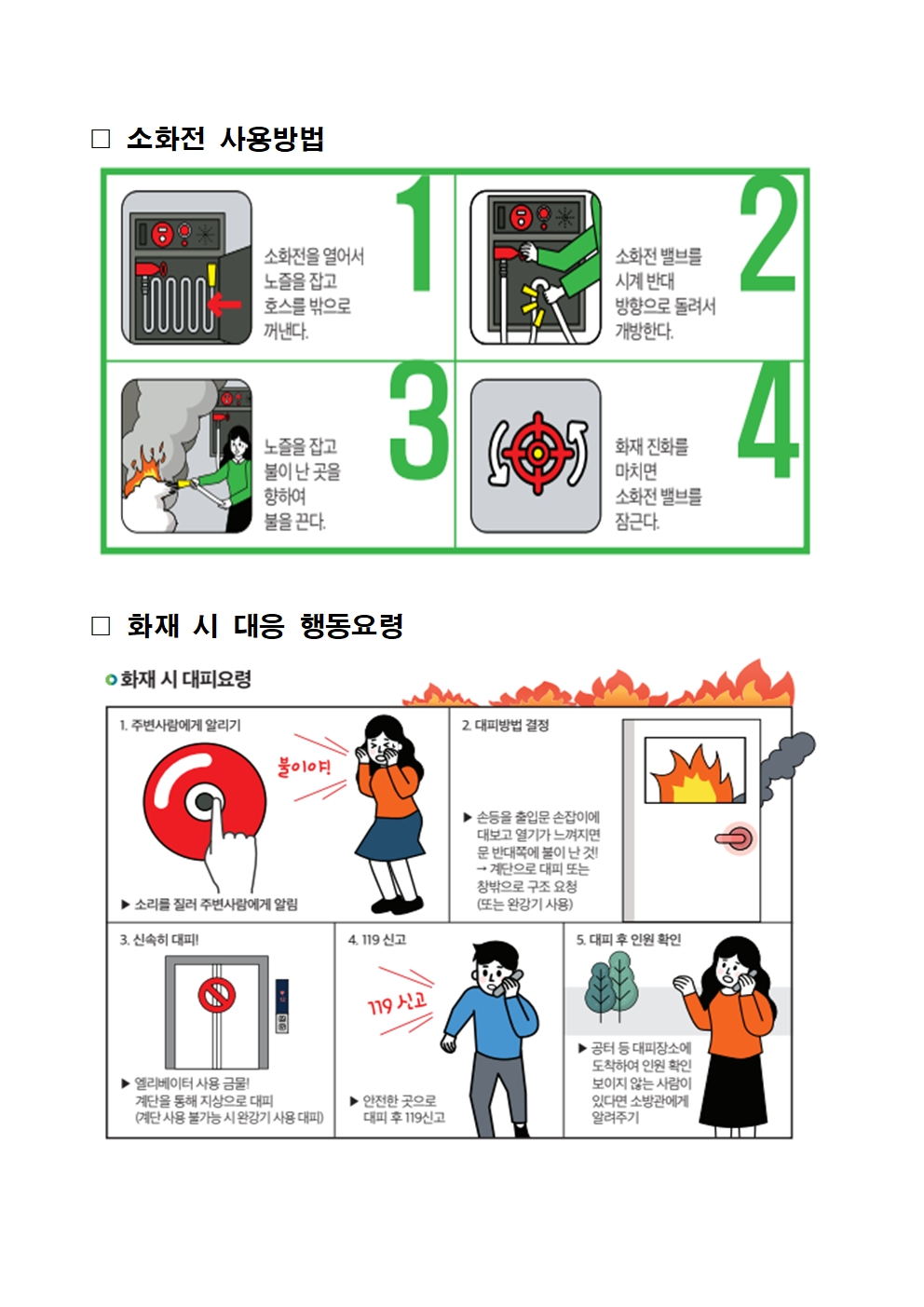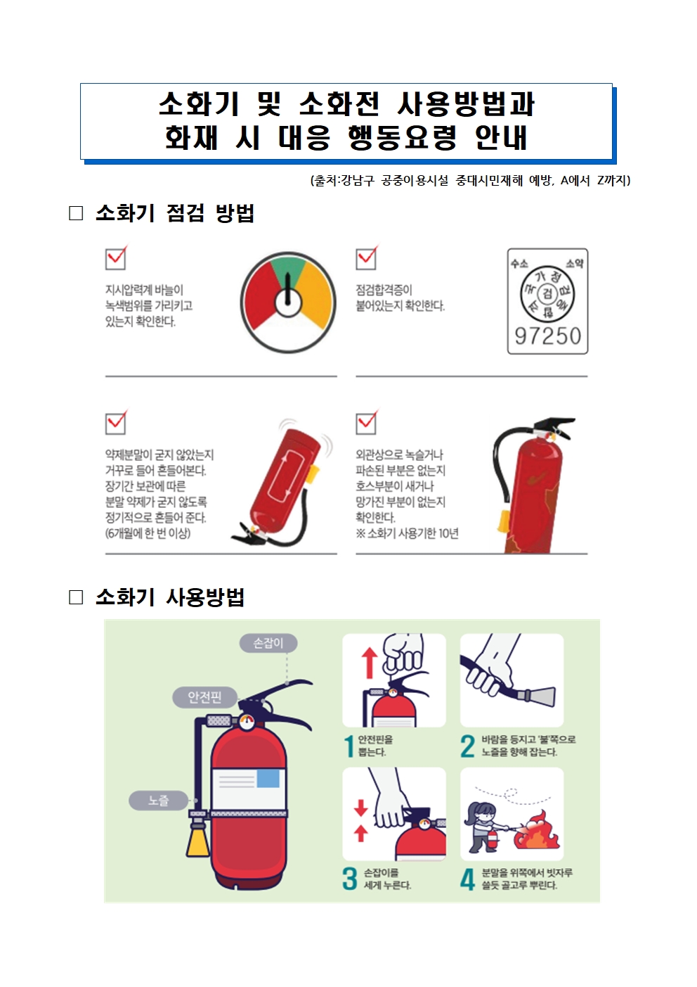 소화기 및 소화전 사용방법과 화재 시 대응 행동요령 안내